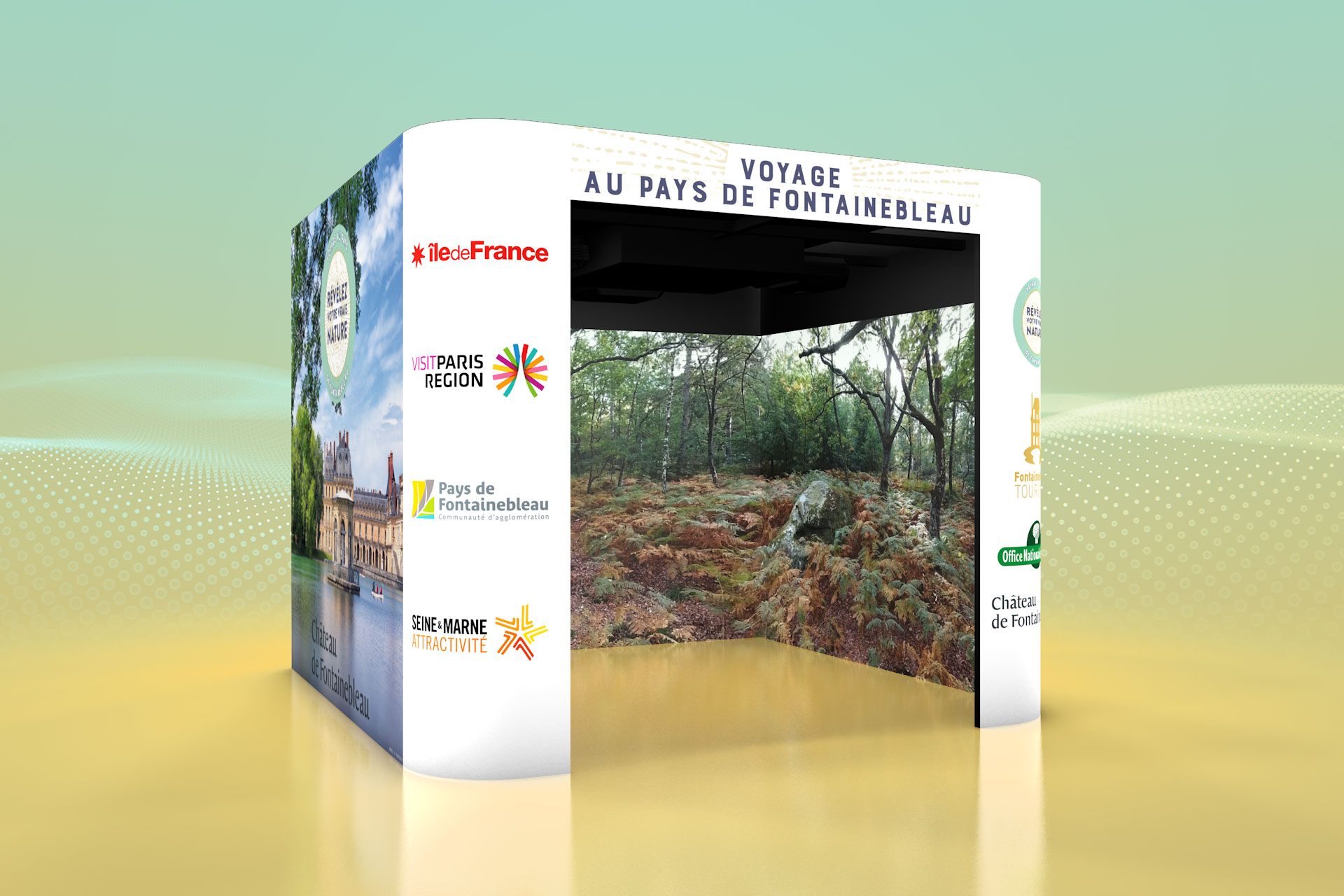 Fontainebleau Tourisme a souhaité utiliser la structure immersive Pod de 9m2 à l’occasion d’une opération de communication à Paris Gare de Lyon du 24 au 27 Septembre 2019. 2 Films 360° on été adaptés au pod, l’un portant sur le château de Fontainebleau, l’autre sur la fôret de Fontainebleau. Les faces du cube immersif furent décorés alternativement de photos du château et de la forêt. Un diffuseur olfactif venait apporter une touche boisée donnant l’impression aux visiteurs de la gare d’être en pleine nature.
